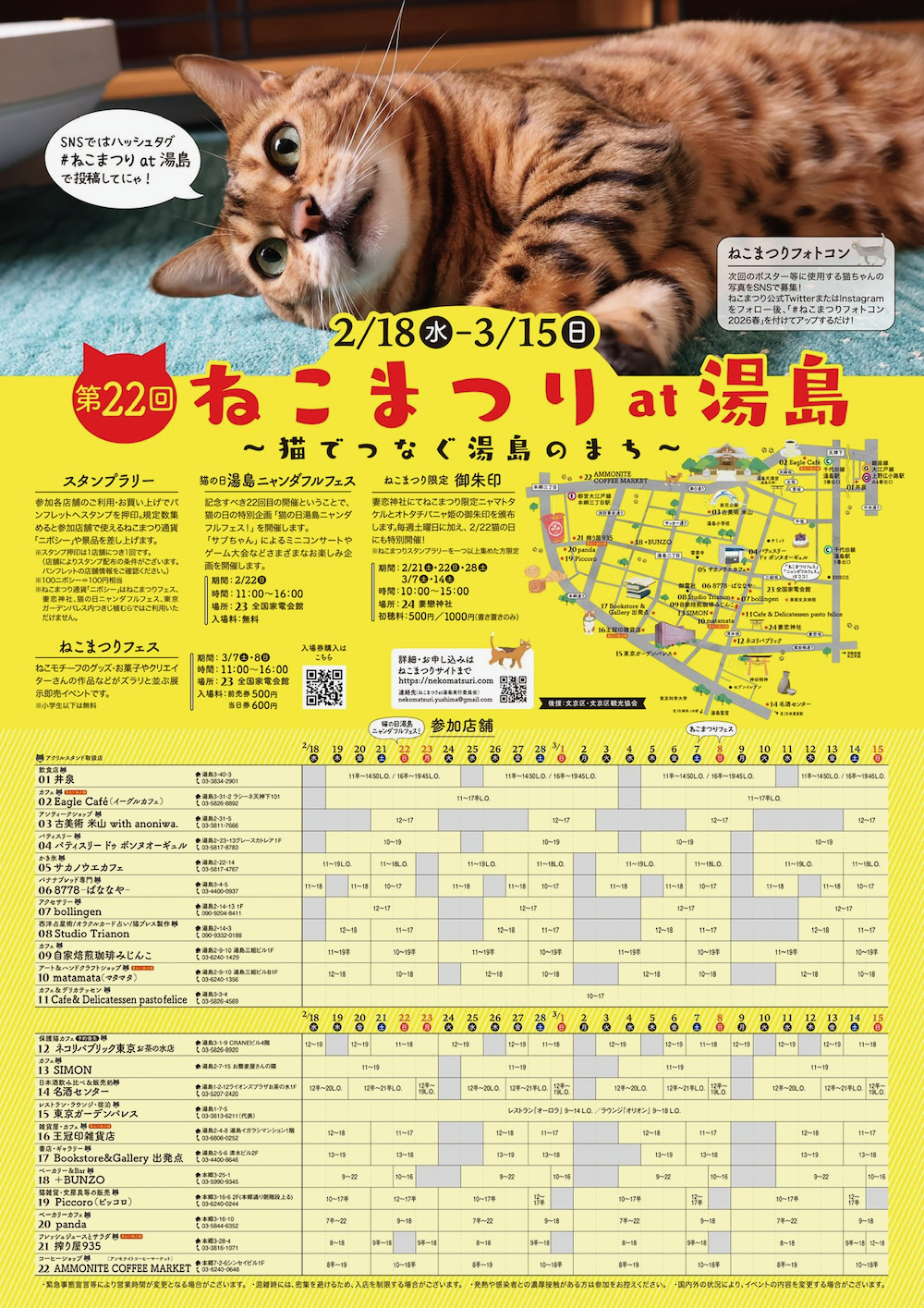 湯島〜本郷地域の18店舗が参加してこの期間限定の猫にまつわる「モノ・こと・食べ物」をご用意してお楽しみいただく地域密着猫イベントです。